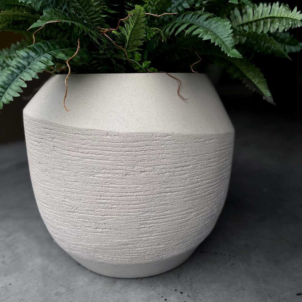 De plantenbak uit de Ruvido collectie valt op door zijn organische vormgeving en stoere, robuuste uitstraling. De subtiele ribstructuur geeft het ontwerp extra diepte en karakter, waardoor deze plantenbak een echte blikvanger is in zowel moderne als natuurlijke settings.